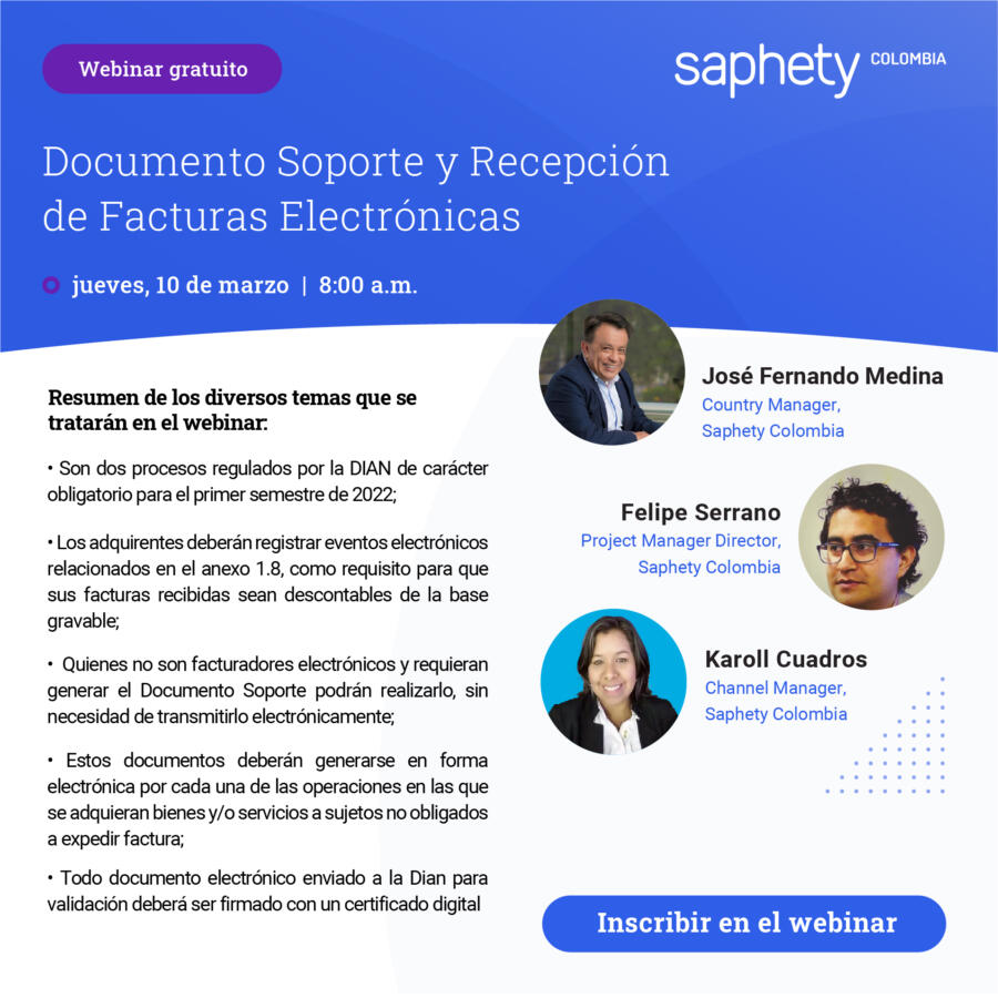 Participe en nuestro Webinar gratuito sobre Documento Soporte y Recepción de Facturas Electrónicas Te invitamos a participar en nuestro webinar gratuito sobre Documento Soporte y Recepción de Facturas Electrónicas. En este espacio, vamos a tocar temas de interés e importancia con respecto a estos dos procesos regulados por la Dian de carácter obligatorio para […]