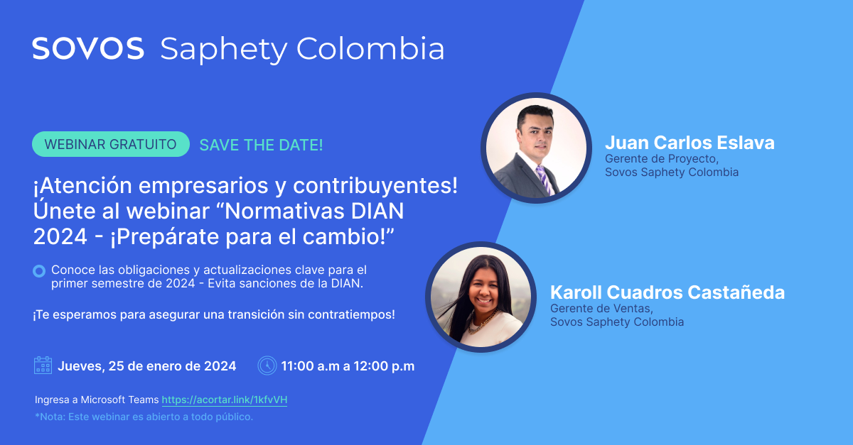 - Karoll Cuadros, Gerente de Ventas en Sovos Saphety Colombia. Comunicadora social con un Magíster en Negocios Digitales y más de 10 años de experiencia en colaboración electrónica y tecnologías de la información. Actualmente, lidera el proceso de Aliados Estratégicos en Sovos Saphety Colombia, contribuyendo al éxito continuo de la empresa y sus clientes.