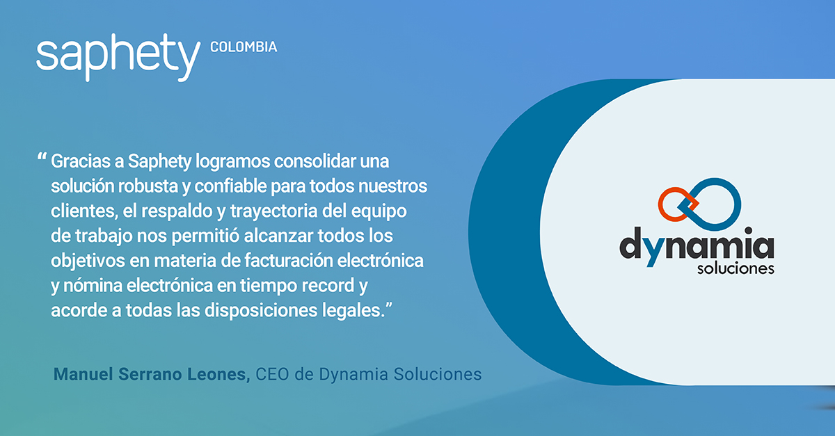 «Gracias a Saphety, logramos consolidar una solución robusta y confiable para todos nuestros clientes, el respaldo y trayectoria del equipo de trabajo nos permitió alcanzar todos los objetivos en materia de facturación electrónica y nómina electrónica en tiempo récord, y acorde a todas las disposiciones legales”, afirmó, Manuel Serrano Leones, CEO de Dynamia Soluciones.