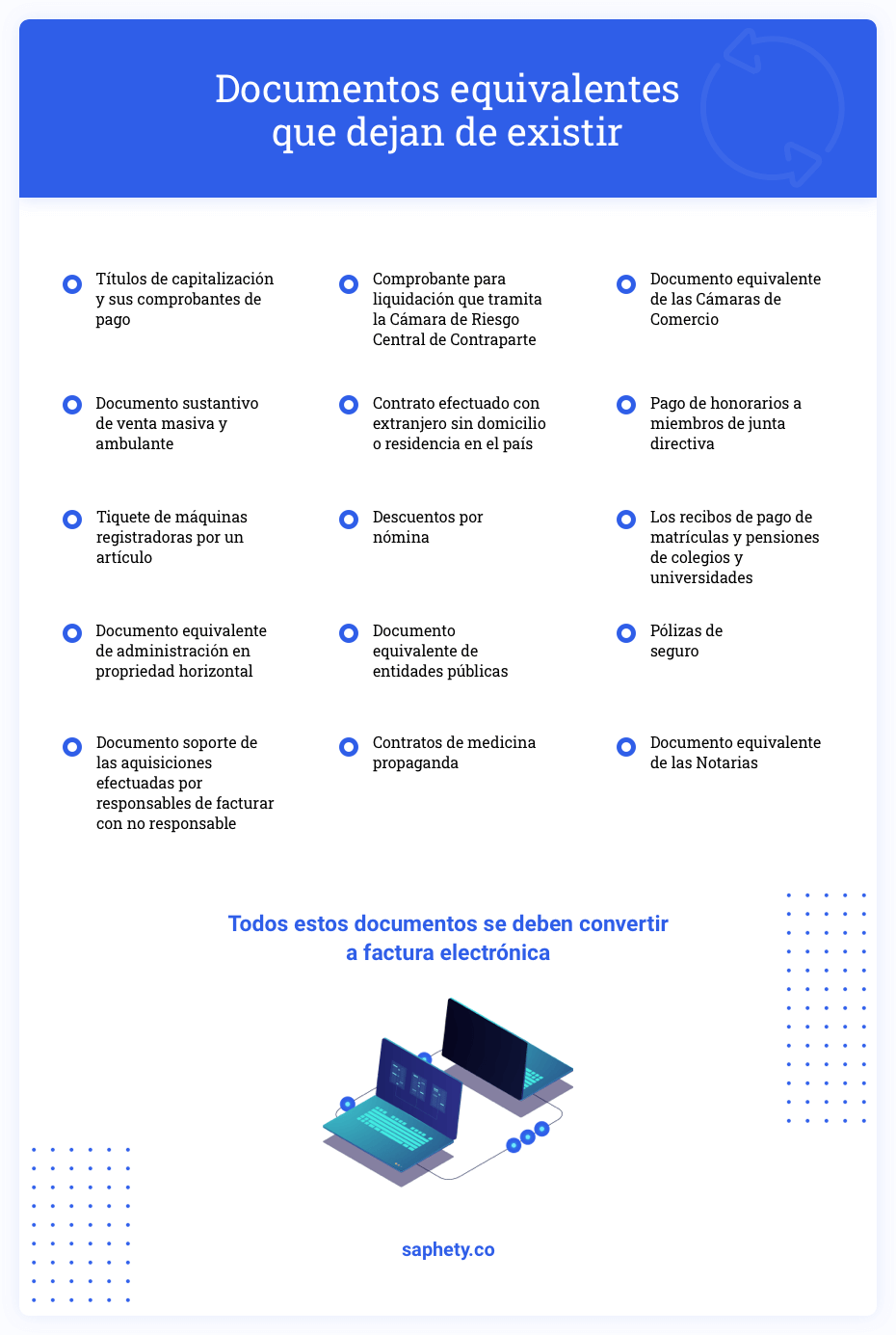 La DIAN por medio del Decreto 358, los reduce a doce, estos son los únicos que esta permitidos como factura. Anteriormente había veintisiete documentos equivalentes, el último decreto saca de circulación a quince.